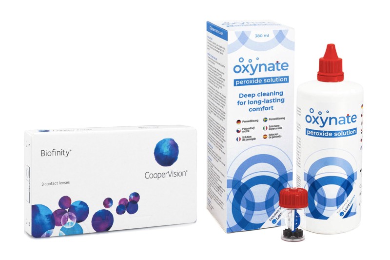 Miesięczne soczewki kontaktowe Biofinity oferujemy w promocyjnym pakiecie z roztworem nadtlenkowym Oxynate Peroxide 380 ml.