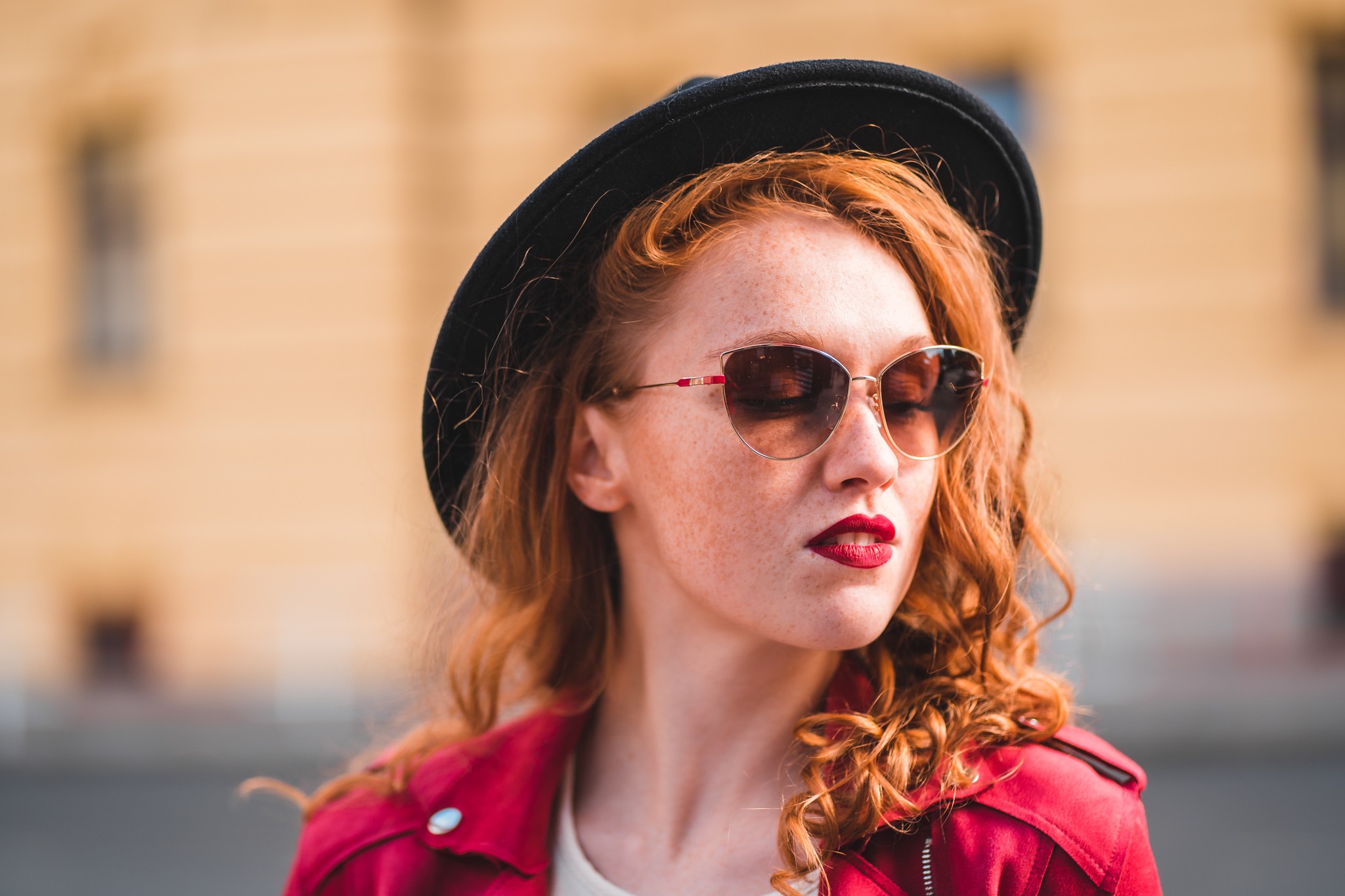- Złoty kolor oprawek doskonale pasuje do ciepłego odcienia skóry oraz do ciemnobrązowych włosów.