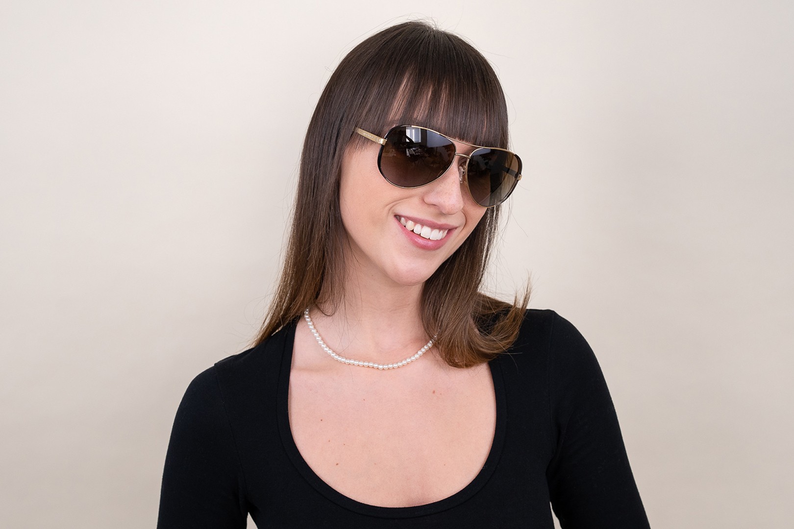 • Złoty kolor oprawek doskonale pasuje do ciepłego odcienia skóry oraz do ciemnobrązowych włosów.