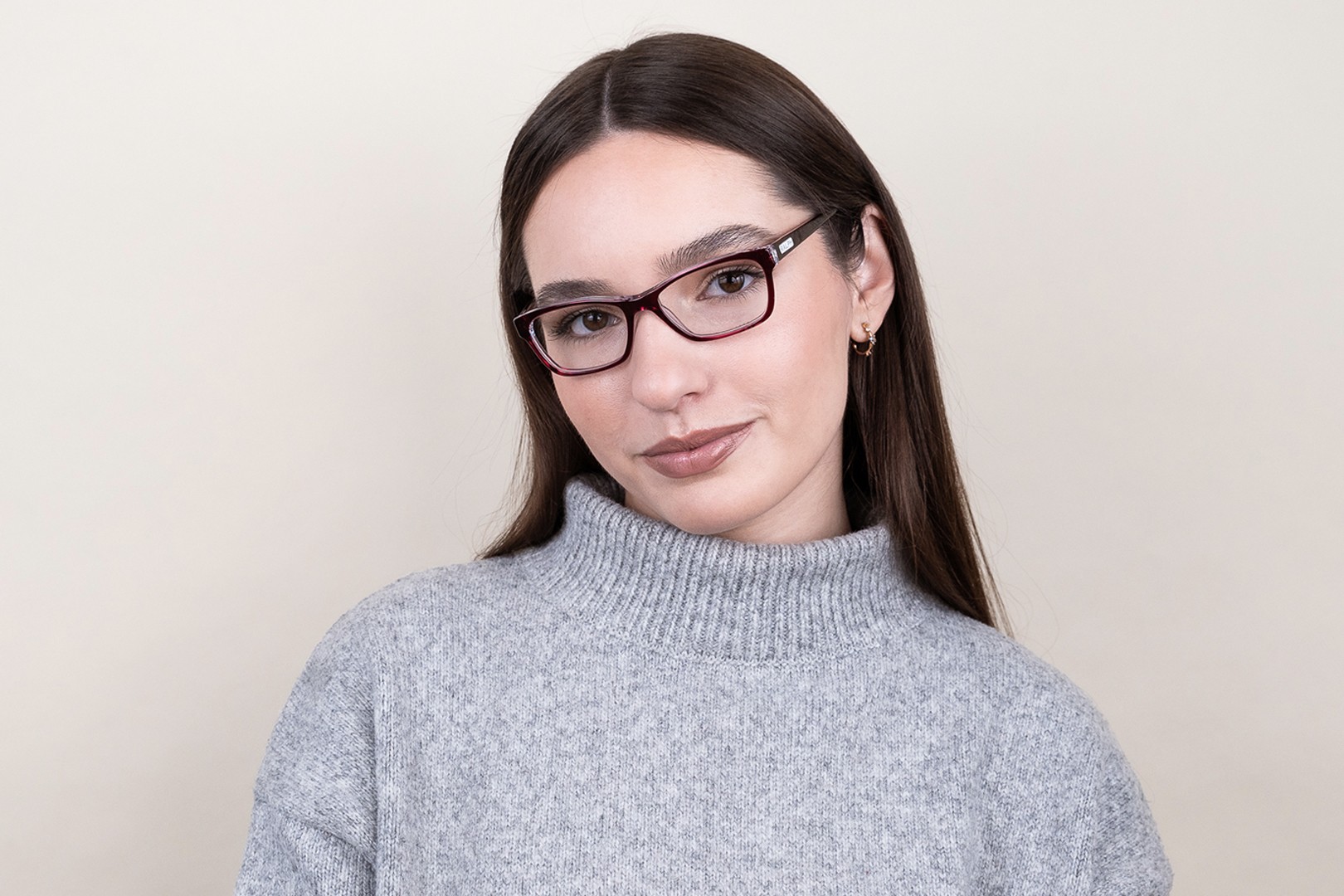 - Czerwony kolor oprawek doskonale pasuje do ciepłego odcienia skóry oraz do czarnych, szarych, białych lub ciemnobrązowych włosów.