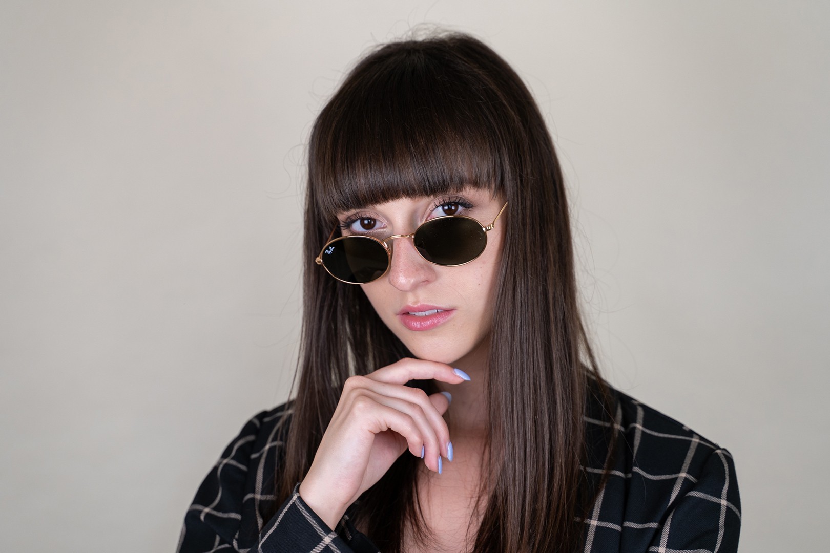 - Złoty kolor oprawek doskonale pasuje do ciepłego odcienia skóry oraz do ciemnobrązowych włosów.