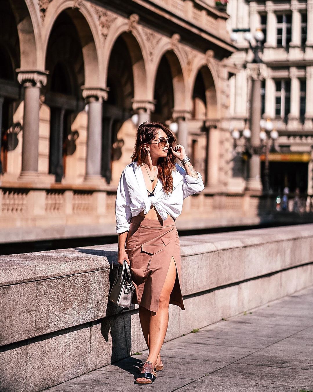 - Złoty kolor oprawek doskonale pasuje do ciepłego odcienia skóry oraz do ciemnobrązowych włosów.